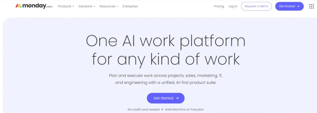 For example, this homepage for Monday.com communicates the value of the product clearly, right at the outset, with the line “One AI work platform for any kind of work”.