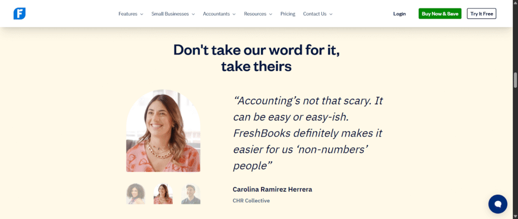 FreshBooks, an accounting software for small businesses, accomplishes this by assigning a noticeable amount of real estate to testimonials, making them more eye-catching and impactful.