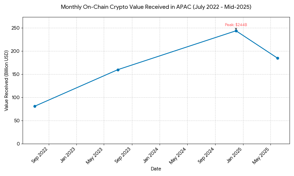 The appetite for crypto in Asia is huge. According to a Chainalysis report from September 2025, the Asia-Pacific (APAC) region showed strong growth in cryptocurrency activity from July 2022 to June 2025. In fact, monthly on-chain value received grew from about $81 billion to a peak of $244 billion by December 2024. That’s a threefold increase in just 30 months!